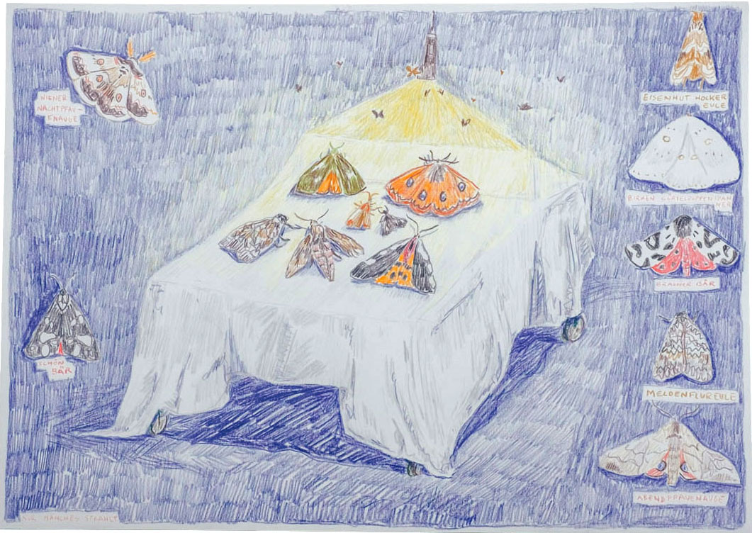 Eine Frau hält ein Plakat vor sich. Lichteinfall in einen dunklen Raum. Auf dem Plakat ist die Illustration einer Person, die eine Pflanze vor sich genau anschaut.