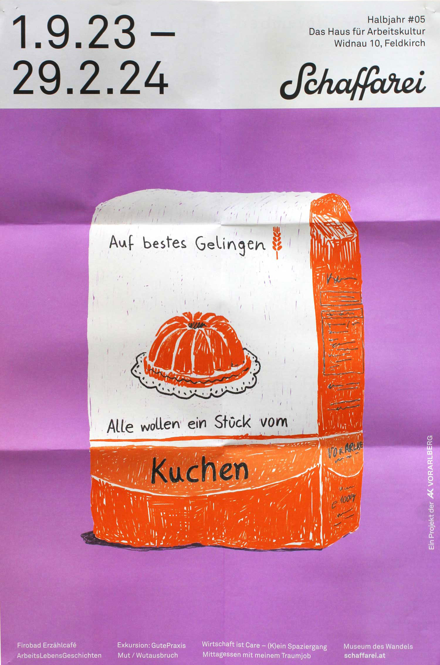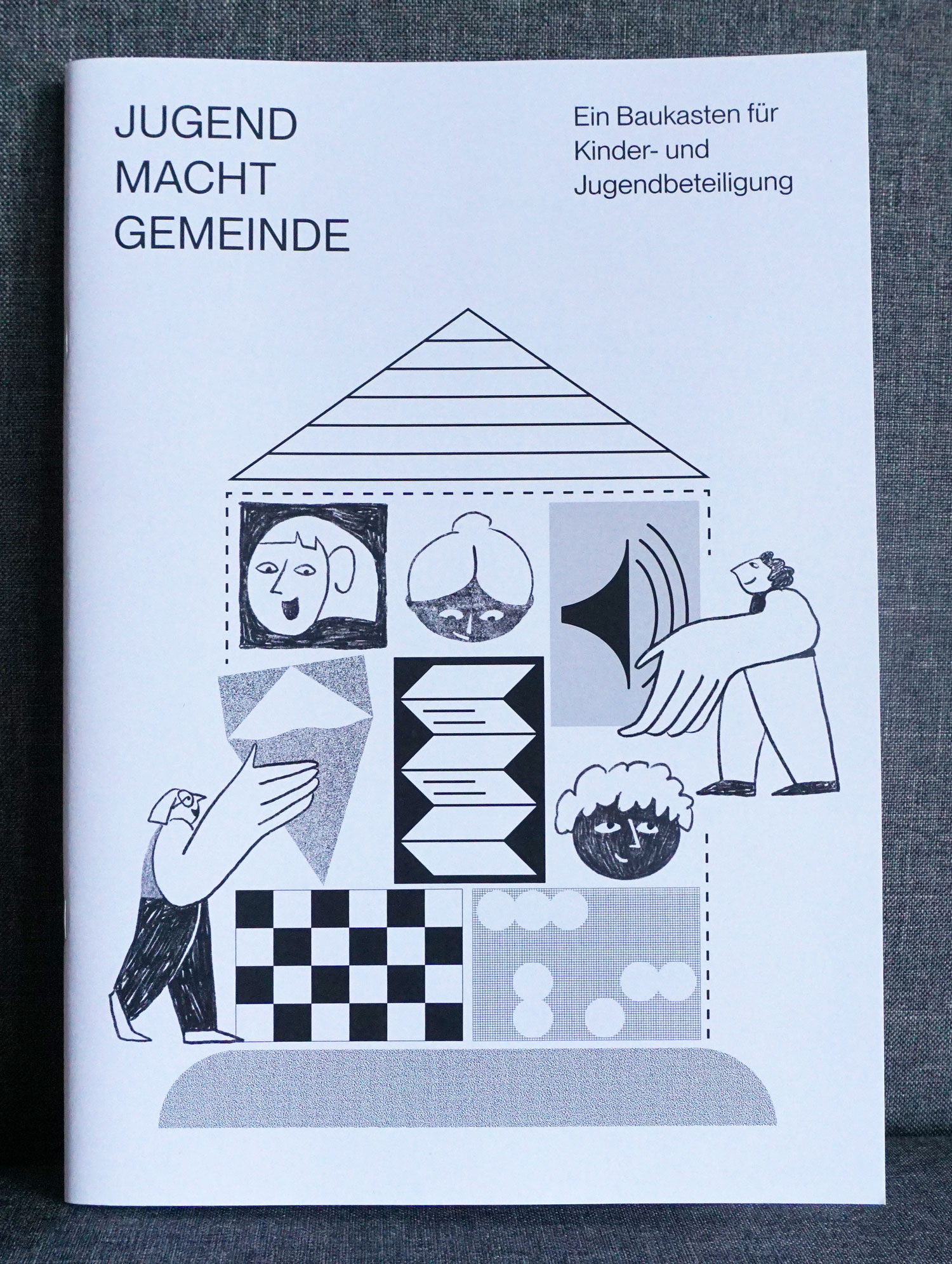 Geöffnete Broschüre auf orangem Hintergrund. Die Überschrift ist bold über beide Seiten gedruckt, auf der linken Seite das Bild eines Liegestuhls, rechts Text.